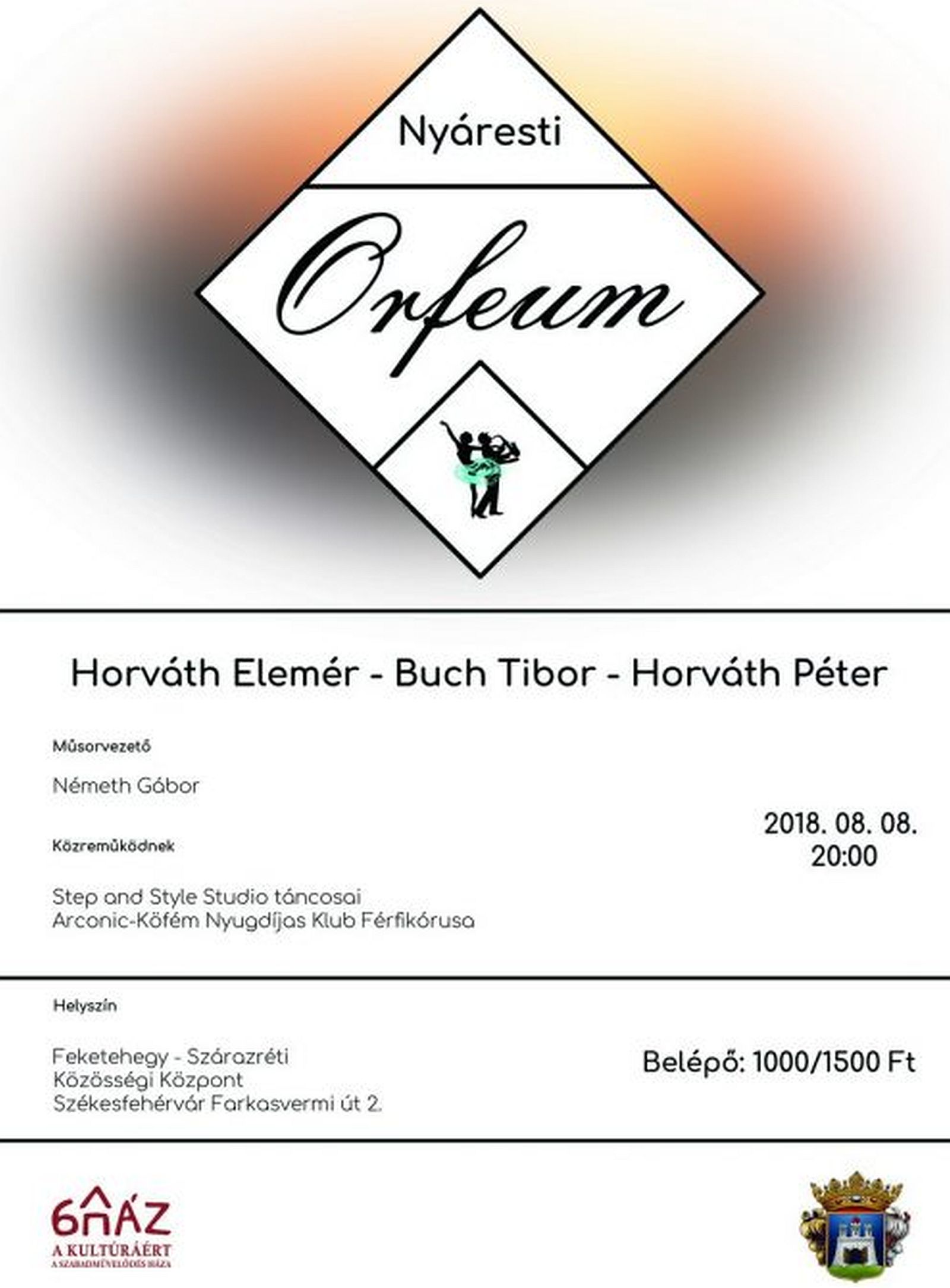 A Nyáresti Orfeum című előadás ugyancsak a Feketehegy-Szárazréti Közösségi Központban lesz, augusztus 8-án. A 20 órakor kezdődő eseményen fellép Horváth Elemér, Buch Tibor és Horváth Péter, közreműködnek a Step and Style Studio táncosai, valamint az Arconic-Köfém Nyugdíjas Klub Férfikórusa. A műsorvezető Németh Gábor lesz, a belépő 1000 (nyugdíjas, diák) és 1500 forint.