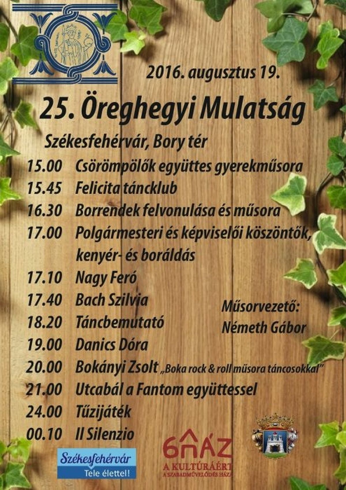 Ismét vendégül látják a város polgárait és minden érdeklődőt az Öreghegyen a nemzeti ünnepet megelőző napon. Augusztus 19-én, pénteken a Bory téren lesz a 25. Öreghegyi Mulatság, amely tartalmas programot ígér neves fellépőkkel, zenészekkel, kenyér- és borszenteléssel, végül pedig utcabállal és tűzijátékkal. A kulturális eseményhez kapcsolódóan forgalomkorlátozásra kell számítani a Bory téren. Kérik az arra közlekedők megértését és türelmét!