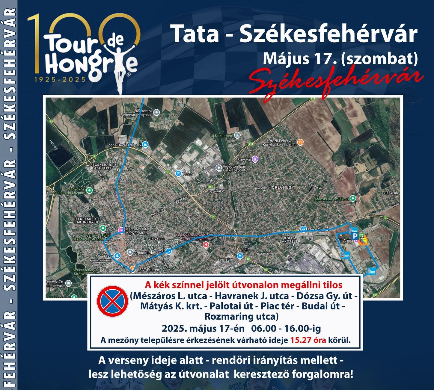Május 17-én, szombaton – a verseny szervezői szerint – előreláthatóan 15.27 perckor érkezik a Tour de Hongrie – Magyar Kerékpáros Körverseny Székesfehérvárra. A negyedik szakasz befutóvárosában időszakos forgalomkorlátozásokkal kell számolniuk a közlekedőknek: a kerékpárosok Zámoly felől érkeznek, így a Mészáros Lázár utca – Havranek utca – Dózsa György utca – Zichy liget – Mátyás király körút – Palotai út – Budai út szakaszt lezárják 15.20 és 16 óra között. Ezen az útvonalon már reggel 8 órától tilos lesz megállni!