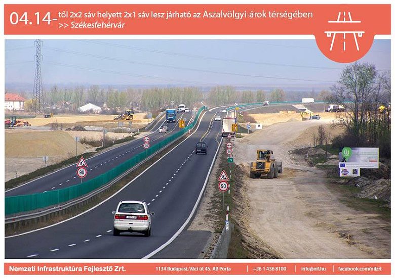 Az új, 2x2 sávos, 7 km hosszú nyomvonalon Székesfehérvár és Csór község közigazgatási területén haladó elkerülő út gyors és biztonságos áthaladást biztosít majd az M7 autópálya, Győr illetve a 8. számú főút irányába. Az Aszalvölgyi árok térségében a kivitelező most kezdi meg az üzemi átjárók kialakítását, ezért keddtől 2x1 sávot használhatnak a közlekedők - adta hírül a NIF Zrt. Közleményük az alábbiakban olvasható.