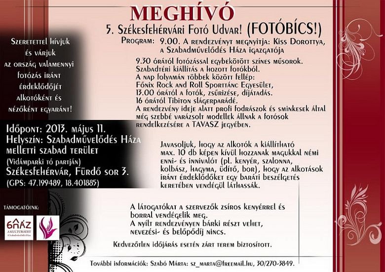 A Székesfehérvári Fotó Udvar – FOTÓBÍCS – eseményeit ötödik alkalommal rendezik meg szombaton 09.30 órától. A Csónakázó-tó melletti szabad területen várják az országból a fotózás iránt érdeklődő alkotókat és nézőket egyaránt. A fotósok maximum 10 képpel nevezhetnek, melyekből szabadtéri kiállítás nyílik, a zsűrizésre és az ünnepélyes díjátadásra 13.00 órakor kerül sor. Közben egész nap fotózással egybekötött színes műsorokkal szórakoztatják a vendégeket, fellép többek között a Főnix Rock and Roll Sporttánc Egyesület, és 16.00 órától lesz slágerparádé. A rendezvény ideje alatt profi sminkesek és fodrászok által még szebbé varázsolt modellek állnak a fotósok rendelkezésére. Rossz idő esetén az intézményben, zárt térben tartják meg a programot.