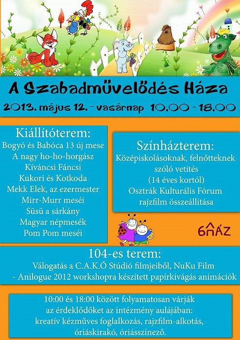 A vasárnapi 10.00 és 18.00 óra között zajló Rajzfilmünnep kiváló kikapcsolódást ígér gyerekeknek, felnőtteknek, családoknak egyaránt. A Szabadművelődés Háza Kiállítótermében olyan régi klasszikus történeteket vetítenek, mint „A nagy ho-ho-horgász”, a „Kukori és Kotkoda”, „Süsü, a sárkány”, magyar népmesék és „Pom-Pom meséi”. A Színházteremben elsősorban középiskolásoknak és a felnőtteknek vetítik a Flying books, Elecktroshock, Zing, Harbour, Between című filmeket az Osztrák Kulturális Fórum felajánlásával, a „Kutya a mennyben” című alkotás pedig a Dán Kulturális Intézet és Dán Filmintézet felajánlásával kerül műsorra. Az Animációs teremben a C.A.K.Ó Stúdió összes felajánlott filmje, NuKu Film – Anilogue 2012 workshopra készített papírkivágás animációk tekinthetőek meg. Csatlakozott a rendezvényhez a székesfehérvári Animono filmkészítő műhely és Hegedűs 2 László alkotó is, akiknek munkáit szintén vetítik. A program teljes ideje alatt többféle kreatív kézműves foglalkozás, rajzfilm-alkotás, óriáskirakó és óriásszínező szórakoztatja a közönséget A Szabadművelődés Háza aulájában.
