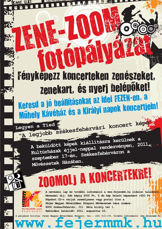 A fotók készülhetnek a FEZEN-en, a Királyi Napokon és a Műhely Kávézóban is. A képeket augusztus 23-ig kell beküldeni. A beérkezett képeket - amennyiben azok megfelelnek a fent sorolt kritériumoknak - a zsűri értékeli, és javasolja nyereményekre, valamint a 2011. szeptember 17-én a Kultúrházak éjjel-nappal rendezvényen debütáló fotókiállításra, a Művészetek házában.