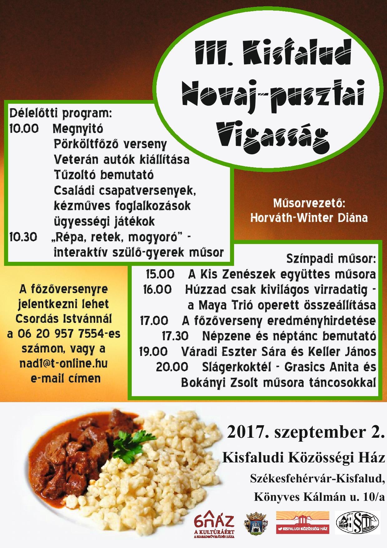 Szeptember 2-án, szombaton harmadik alkalommal lesz Vigasság Kisfalud Novaj-pusztán. A program 10 órakor ünnepélyes megnyitóval veszi kezdetét, majd különböző szórakoztató versenyekkel és bemutatókkal folytatódik, miközben pedig pörköltfőző verseny lesz.