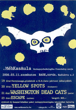 A Méhkasaula Kulturális Egyesület ismét egy külföldi előadót csábít Székesfehérvárra március 11-én. Ezúttal Párizsból érkezik egy pszichobilly együttes a Washington Dead Cats. A csapat a kemény rock and roll menetek mellet a metál zene világából is átvesz elemeket. A zenekar nem csak hangzásvilágával, de a látvánnyal is megragadja a hallgatót, hiszen a koncerteken félelmetes maszkokat öltenek és tüzet is fújnak a szájukból. Az est vendége lesz még a „belezős rakendról” zenét játszó Yellow spot is, illetve Székesfehérvár egyetlen SKA együttese az Escape. A koncertek mellett lesz plakát kiállítás is a Washington Dead Cats tagjainak munkáiból.