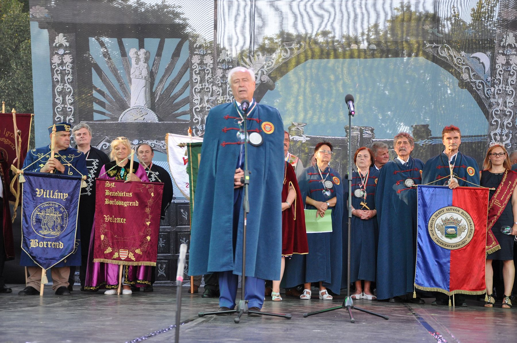 A delegációk bemutatását követően Mészárovics Imre, a Noé-hegyi Szent István Borrend elnök-nagymestere köszöntötte a megjelenteket. Mint fogalmazott, büszkén mutatták be a vendégeiknek a Belvárost. A szakmai napjuk és a színpadi ünnepségük már hagyomány, mellyel idén is igyekeztek méltó módon hozzájárulni Szent István napjához. A legfontosabb mozzanatnak nevezte, hogy az új borlovagrend-tagokkal erősíteni tudják a borrendjük tevékenységét és szellemiségét. Köszönetét fejezte ki mindazoknak, akik rengeteg munkájukkal előkészítették és lebonyolították a Királyi Napokat.