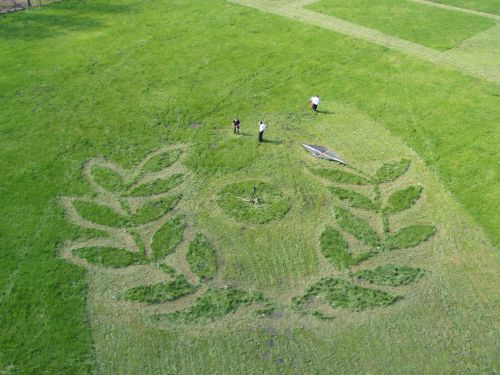 A bőrgyár kulturális csoport szervezésében zajlott tegnap a Fűnyíró Fesztivál a Palotavárosi tavak mellett elterülő réten. A "Bőrgyári művészek", Kocsis Balázs, Garami Richárd vezetésével fűnyíróval vágtak a rét füvébe óriási képeket, melyeket aztán emelős tűzoltókocsival lehetett megnézni. A fűbe vágtak egy nagy tányért is melyet este 6 –kor a barátok és résztvevők kitöltöttek, valódi hússal és erről, sárkányrepülőről készítettek képet. (Tekintse meg képgalériánkat!)