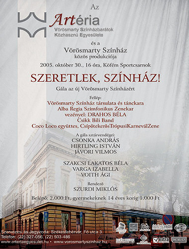 "Szeretlek, színház!" címmel jótékonysági gálaműsort rendez az ARTéria Vörösmarty Színházbarátok Közhasznú Egyesülete és a Vörösmarty Színház a Köfém Sportcsarnokban október 30-án, vasárnap 16 órakor.