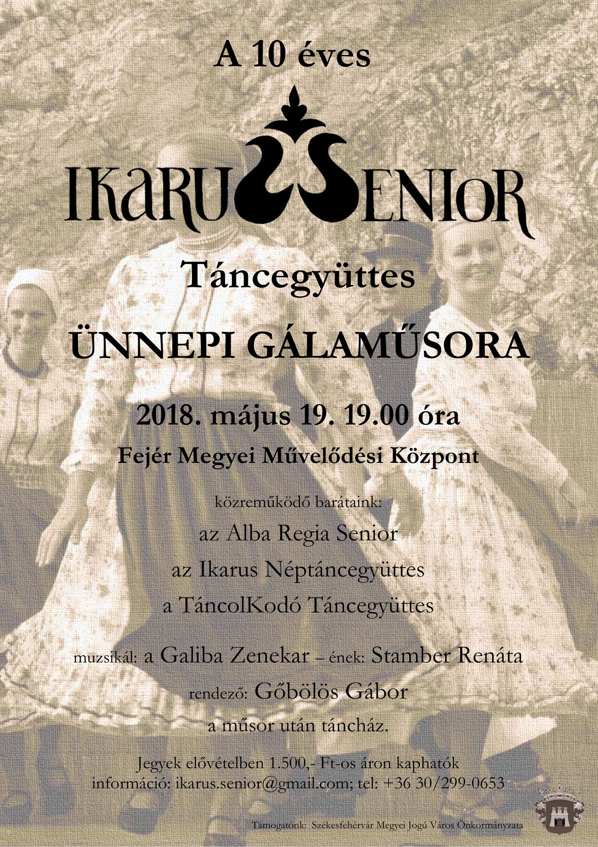 Gálaműsorral ünnepli 10 éves fennállását az Ikarus Senior Táncegyesület. Május 19-én, szombaton 19 órakor kezdődik az előadás a Fejér Megyei Művelődési Központban, ahol a csoport mellett színpadra lép az Alba Regia Táncegyüttes Senior csoportja, valamint az Ikarus és a TáncolKodó néptáncegyüttes.