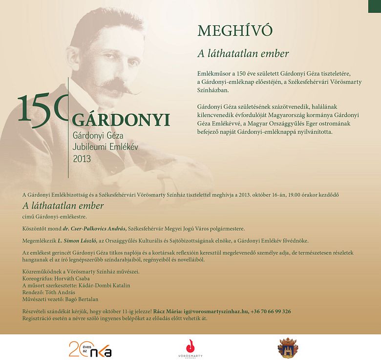 A láthatatlan ember címmel Gárdonyi-emlékest lesz október 16-án, szerdán este hét órakor a Vörösmarty Színházban. Az emlékest gerincét Gárdonyi Géza titkos naplója adja, de legnépszerűbb színdarabjaiból, regényeiből és novelláiból is részletek hangzanak majd el. 2013-ban ünnepeljük az egyik legnépszerűbb magyar író, Gárdonyi Géza születésének 150. évfordulóját.