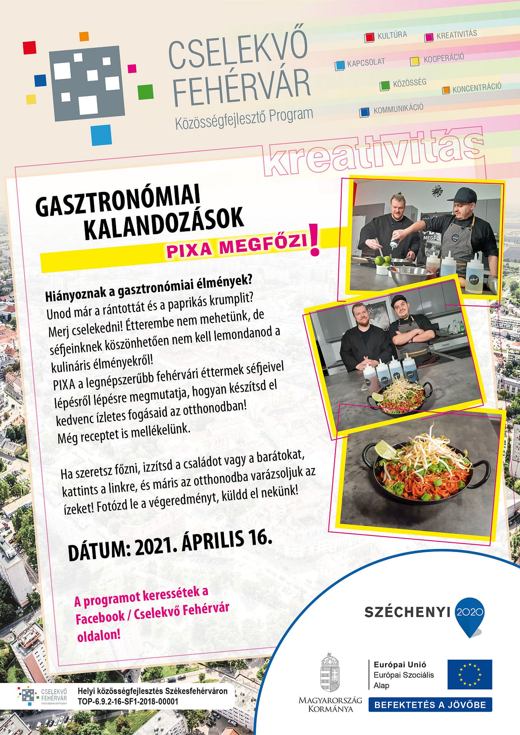 „Hiányoznak a gasztronómiai élmények? Unod már a rántottát és a paprikás krumplit? Merj cselekedni! Étterembe nem mehetünk, de séfjeinknek köszönhetően nem kell lemondanunk a kulináris élményekről!” – ígéri a Cselekvő Fehérvár Közösségfejlesztő Program legújabb aktivitásának plakátja, amelynek keretében április 16-tól Pixa főzi le a netet.