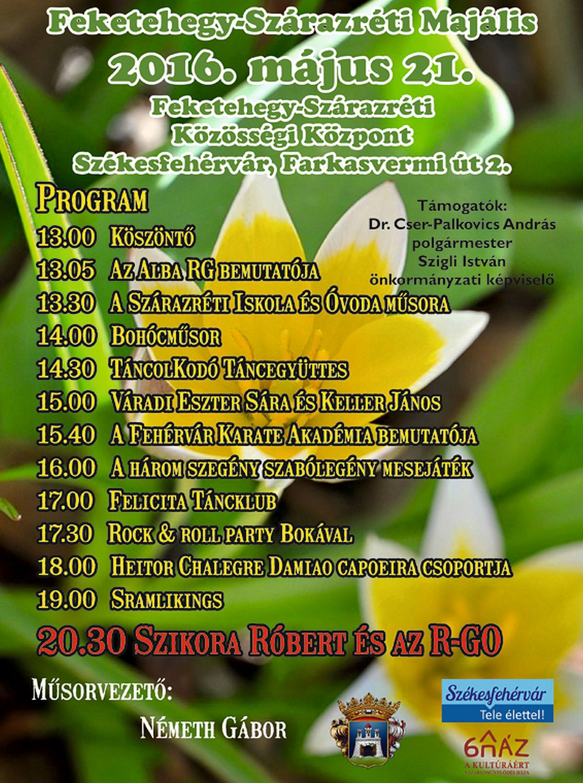 Táncbemutatóval, zenei műsorokkal, bohócelőadással, színpadi produkciókkal, illetve Szikora Róbert és az R-GO koncertjével is várják a Feketehegy-Szárazréti Majális résztvevőit. A kulturális eseménynek 2016. május 21-én, szombaton a Feketehegy-Szárazréti Közösségi Központ ad otthont. A jövő szombati ingyenes rendezvényre mindenkit szeretettel várnak a szervezők.