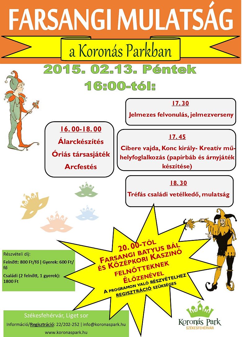 Székesfehérváron a farsangfarki rendezvények sora február 13-án, pénteken 17.00 órakor kezdődik a Köfém Művelődési Házban. A „Kultúrházak Éjjel – Nappal” országos programsorozat keretében rendezik meg a „Farsangi Hangszermesék” elnevezésű interaktív farsangi zenés mesejátékot sok hangszerrel, tánccal. A közönséget – óvodásokat és iskolásokat – jelmezben várják. A Koronás Park is készül Farsangi Mulatsággal február 13-án, pénteken 16.00 órakor. A gyermekeknek szóló rendezvény álarckészítéssel, arcfestéssel kezdődik és lehet játszani az óriás társasjátékkal is. 17.30 órakor kerül sor a jelmezes felvonulásra és jelmezversenyre. 17.45 órakor kreatív műhelyfoglalkozáson papírbábot és árnyjátékot lehet készíteni - Cibere vajda, Konc király figuráival. 18.30 órától tréfás családi vetélkedővel ér véget a gyerekek számára a Farsangi Mulatság, majd 20.00 órakor a felnőtteknek farsangi batyusbállal és középkori kaszinóval folytatódik. Erre a programra előzetes regisztráció szükséges!