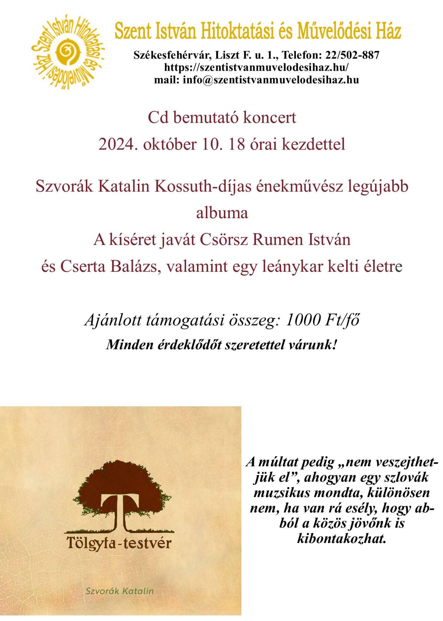 Október 10-én, csütörtökön 18.00 órakor kezdődik Szvorák Katalin Kossuth-díjas és Liszt Ferenc-díjas magyar népdalénekes, előadóművész legújabb, Tölgyfa-testvér című albumának bemutatója. Az eseményen közreműködik Csörsz Rumen István zenész, zenetörténész és Cserta Balázs zenész, valamint egy leánykar. A dalok anyaga Varga Imre költő szlovák népköltészeti műfordításai alapján került az új albumra. Az ajánlott támogatás összeg 1.000 forint.