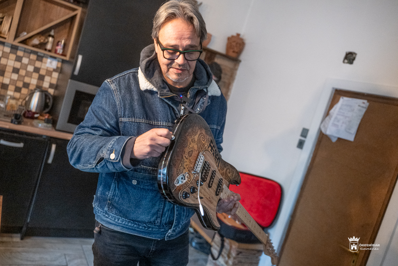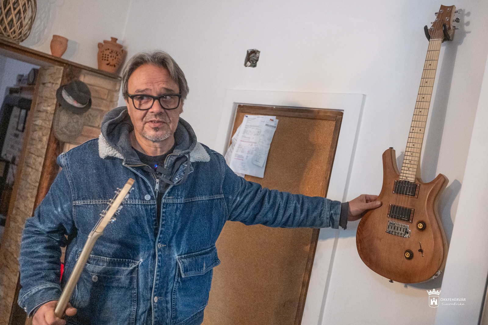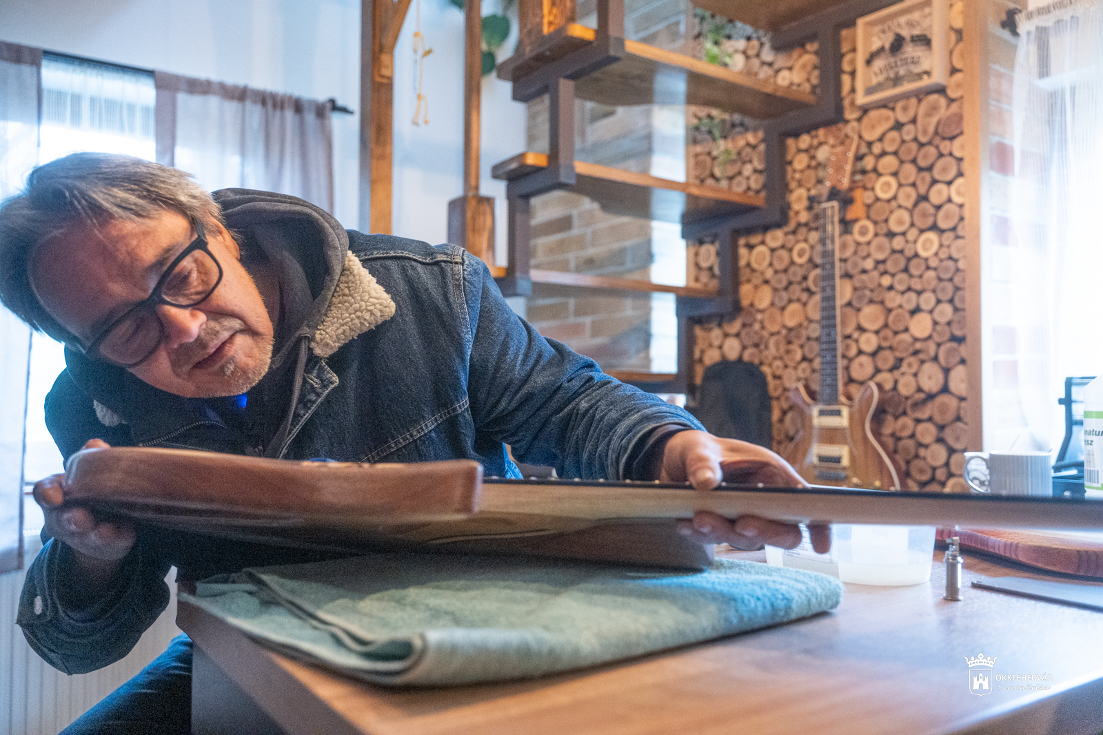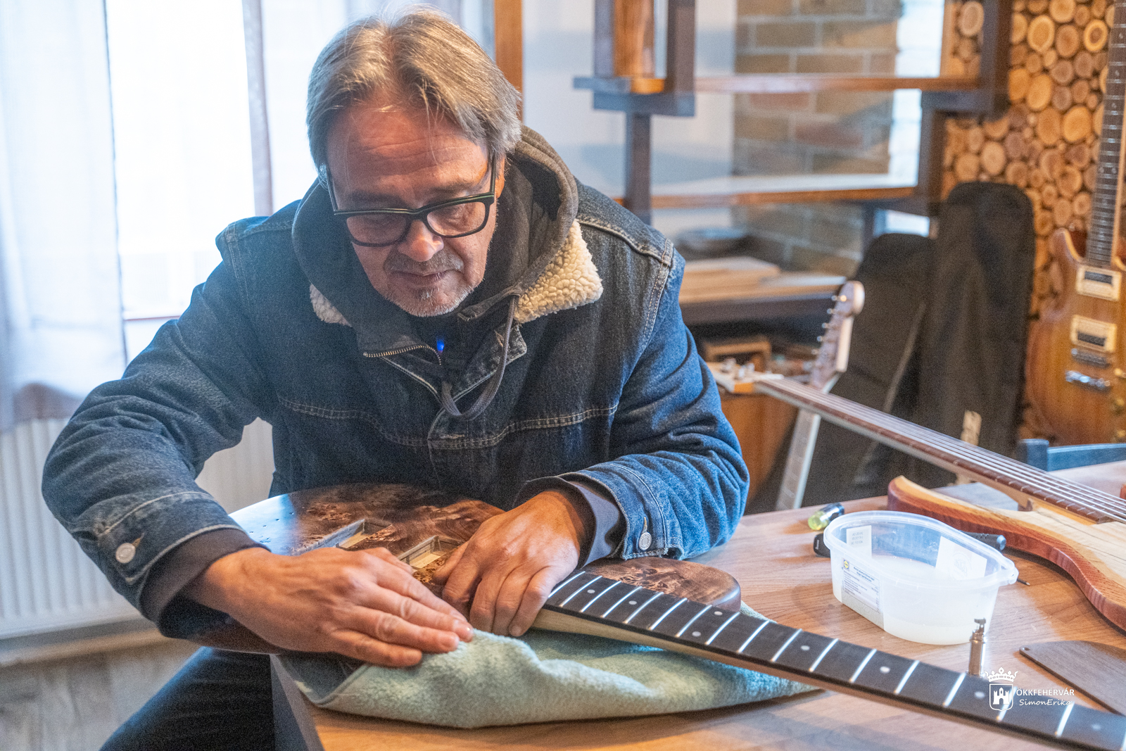 Az agárdi műhelyben előkerül egy gesztenyefa borítású, szinte festményt idéző, zöldes árnyalatú műremek, aztán a Kiss G. László számára készülő gitár, majd az ismert székesfehérvári zenész, Mits Gergely kérésére születőben lévő szép példány is, mi meg ámulunk és bámulunk, no meg – mivel gitározni nem tudunk – csak simogatjuk a fantasztikus alkotásokat.