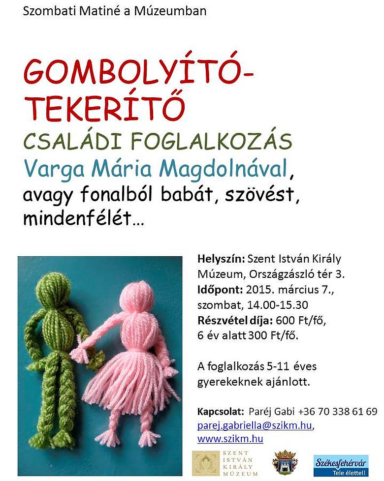 2015. március 7-én, szombaton 14 órától gombolyító- tekerítő családi foglalkozást tartanak a Szent István Király Múzeumban (Országzászló tér 3.). A kulturális programon Varga Mária Magdolna tart foglalkozást, ezúttal a fonalas mesterségekkel ismerteti meg az érdeklődőket, kicsik és nagyok is találhatnak elkészíteni, kipróbálni való érdekességet. Az esemény 5-11 éves gyerekek részére ajánlott.