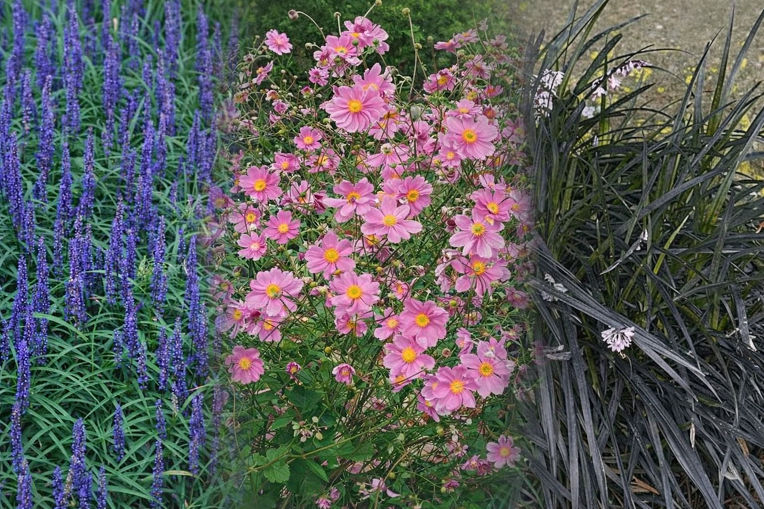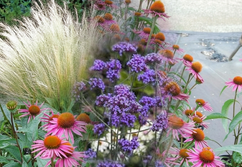 A napos részekre (fenti kép) árvalányhaj, óriás vasfű (ernyős verbéna) és bíborkasvirág kerül. Az árnyékos részekre (lenti kép) pedig őszi szellőrózsát, gyöngyikés gyepliliomot és feketelombú kígyószakállt ültetnek.