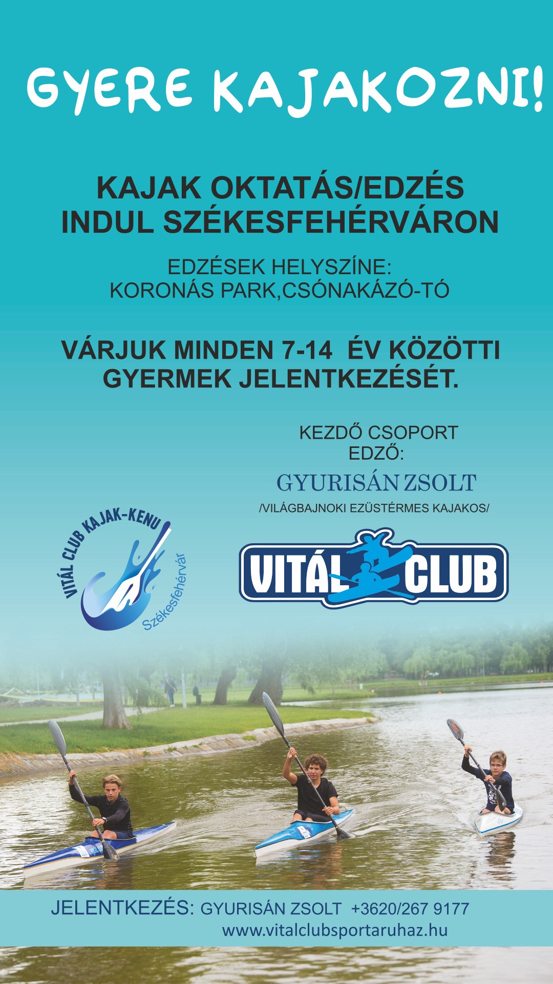 Márciustól kajakoktatást indít a Club Vital Kajak-Kenu Egyesület a 7 és 14 év közötti fiataloknak. Az edzések helyszíne a Club Vital székhelye a Koronás Parkban és a Csónakázó-tó.