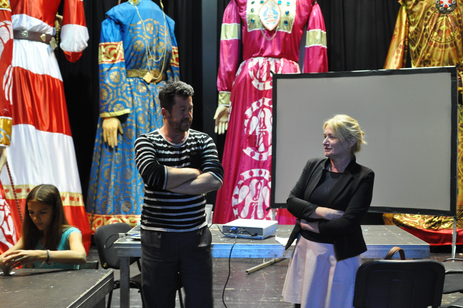 Kovács Yvette, az augusztusi Koronázási Szertartásjáték előadásának jelmeztervezője a középkori viseletekről tartott előadást a gyerekeknek, és azt is bemutatta, hogyan tudják fényképek, és pontos dokumentáció nélkül feltérképezni a korabeli ruhákat. A Vörösmarty Színház hátsó színpadán péntekig folytatják a munkát a Tóvárosi, a Széna Téri, a Zentai Úti és a Munkácsy Mihály Általános Iskolából érkezett diákok.