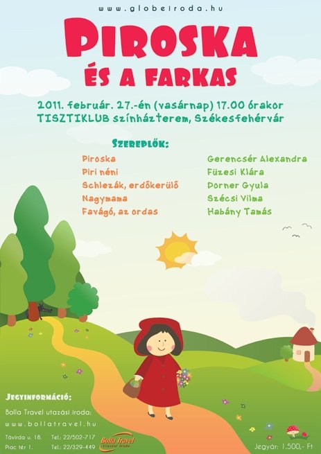 Piroska és a farkas című előadás február 27 -én 17.00 kor kezdődik a Tisztiklub Színháztermében. A gyermekeknek szóló előadásra óvodásokat és kisiskolásokat várnak. A történet szerint Piroska és édesanyja vidáman éldegélnek erdőszéli házukban. Idejárnak a favágók, szénégetők, madarászok, s no persze az erdő őre, Schlezák, az erdőkerülő is.