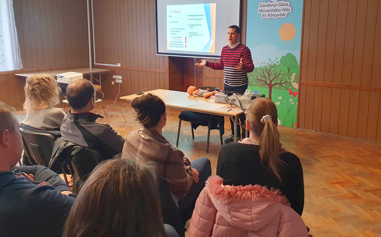 Az előadást Barta Balázs, a Humán Szolgáltató Intézet munkatársa tartotta, aki elmondta, hogy a foglalkozás célja az, hogy a csecsemő és kisgyermekkorban előforduló balesetekkel és minden olyan váratlan dologgal megismerkedjenek a szülők, ami csak előfordulhat egy kisgyermekek életében. Az előadáson szó volt azokról a hirtelen kezdődő és riasztó tüneteket mutató eseményekről is, amelyek nagyon gyakran mentőhívással végződnek. De amíg a mentő odaér, amíg a segítség megérkezik, addig szükség van arra, hogy ők is helytálljanak. Barta Balázs felvázolta az eshetőségeket egészen a legrosszabbaktól kezdve, amiktől mindenki fél, hogy például eszméletvesztéssel járó állapot következik be, vagy görcsrohama van a gyereknek.