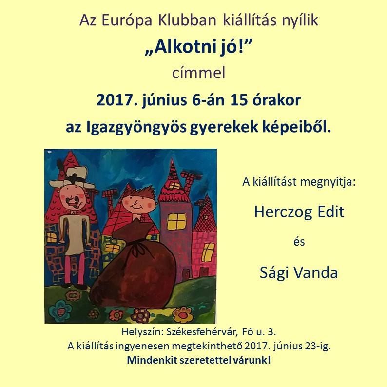 Alkotni jó! – ezzel a címmel nyílik kiállítás június 6-án, kedden 15 órakor az Európa Klubban (Fő utca 3.). Az Igazgyöngy Alapítvány által támogatott gyerekek alkotásaiból álló tárlatot Herczog Edit és Sági Vanda nyitják meg. Az Alapítvány művészeti iskolájában, Berettyóújfalu térségében 6-22 éves, nagyrészt hátrányos helyzetű fiatalok alkotnak és táncolnak, mintegy 600-an. A gyermekközpontú képzőművészeti műhely nemzetközi szinten is jegyzett, kiemelt szempontjaik az egyéniség és az identitás felvállalása, az önkifejezés. A kiállítás a tehetségek megmutatása mellett figyelemfelhívó programja a szociális, társadalmi érzékenyítésnek.