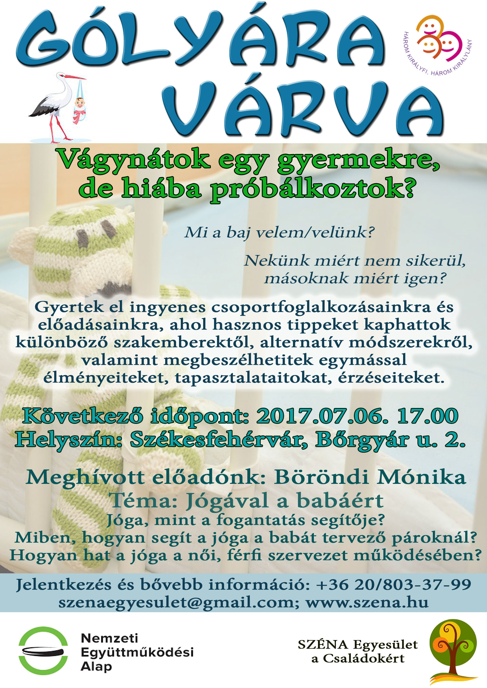 „Gólyára várva” programsorozat indult a gyermektelen pároknak. A SZÉNA Egyesület azoknak a pároknak szervez foglalkozásokat, akik hiába várnak a gyermekáldásra, valamiért ez mégsem sikerül. A csoportfoglalkozások tematikus és önsegítő foglalkozások egyben. A Gólyára várva című program következő előadását július 6-án, csütörtökön 17 órakor Böröndi Mónika tartja arról, hogyan hat a jóga a női és a férfi szervezetre, valamint hogyan segítheti a fogantatást.