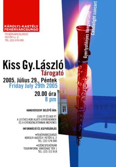 Július 29-én pénteken 20 órai kezdettel Kiss Gy. László gyertyafényes tárogató hangversenyére látogathatnak a kuruc kori zene, a történelmi táncok, huszár nóták és szomszédos országok népzenéje iránt érdeklődő zenekedvelők. Kiss Gy. László élő koncertjein műsorának nagy része régi magyar táncokból, hagyományos népzenei anyagokból és a tárogató közismert repertoár darabjaiból játszik.