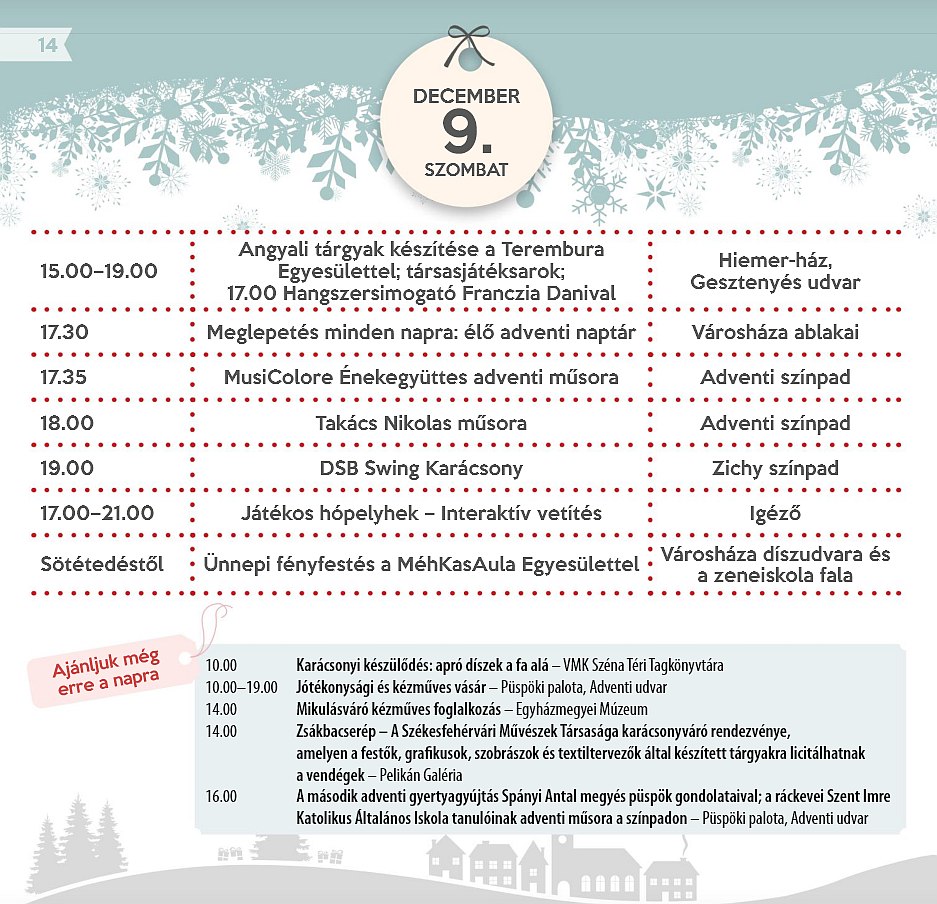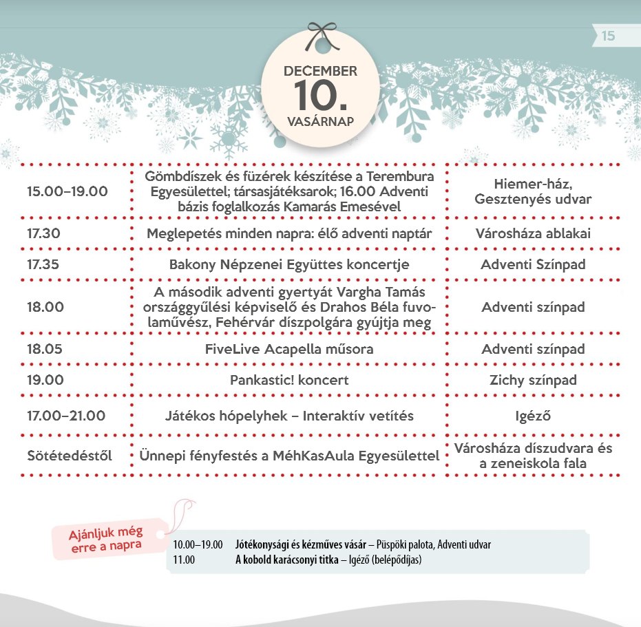 Az Adventi színpadon a Bakony népzenei együttes 17.35 órakor kezdődő koncertjét követően gyújtják meg a második gyertyát a város adventi koszorúján, közreműködik Vargha Tamás országgyűlési képviselő és Drahos Béla fuvolaművész, Fehérvár díszpolgára. Ezt követően 18.05 órától a FiveLive Acapella ad műsort, melyet 19.00 órától a Zichy színpadon a Pankastic! koncertje követ.