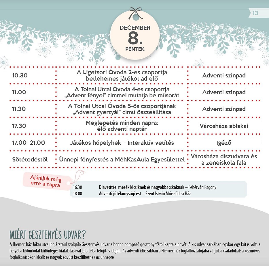 December 10-én, vasárnap, szintén 10.00 és 19.00 óra között várja vendégeit a Püspöki Palota adventi udvara.15.00 és 19.00 óra között a Hiemer-ház Gesztenyés udvarán gömbdíszeket és füzéreket lehet készíteni a Terembura Egyesülettel, újra lesz társasjátéksarok és 16.00 órától adventi bázis foglalkozás Kamarás Emesével.