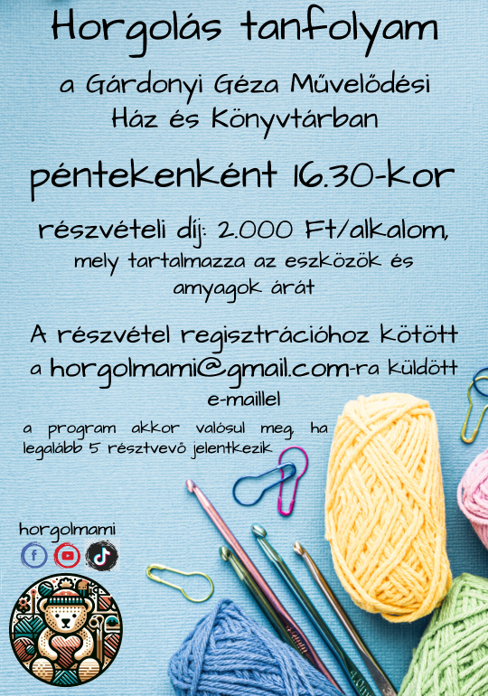 Ugyancsak péntekenként, de délután 16.30-kor kezdődnek a horgolótanfolyamok a Gárdonyiban.