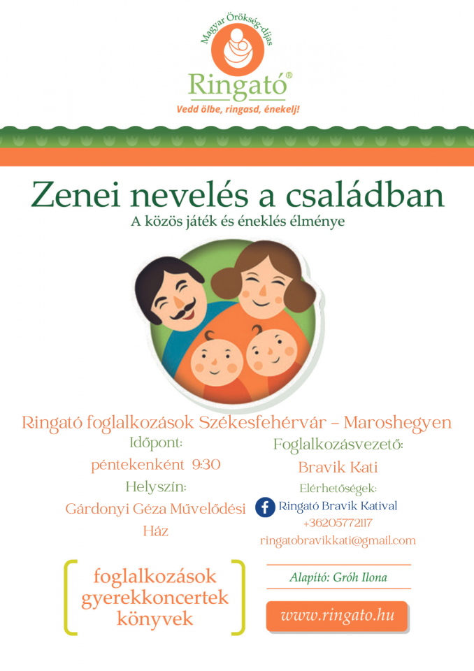 Bravik Katalin 9.30-tól tartja a találkozókat, amelyek célja, hogy oldott, szeretetteli légkörben ismertessék meg a kisgyermekes szülőkkel a zenei nevelés lehetőségeit, a szülők és a gyerekek átéljék a közös éneklés és játék élményét. Élő énekszóval, mondókákkal, dajkarímekkel, hangszerjátékkal készülnek, és akinek kedve van, bekapcsolódhat az ölbéli játékokba is. A Ringatókra már néhány hónapos kisbabákkal lehet érkezni, a felső korhatár pedig az óvodáskor kezdete.