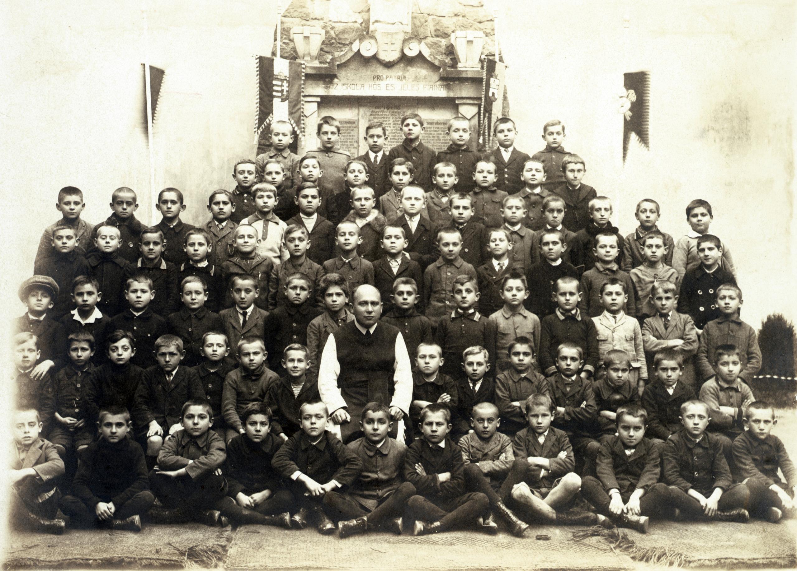 Osztálykép 1925-ből, háttérben „Az iskola hős és jeles fiainak” állított emlékművel. A tanulók között Cséplő Pál latin- és magyartanár.