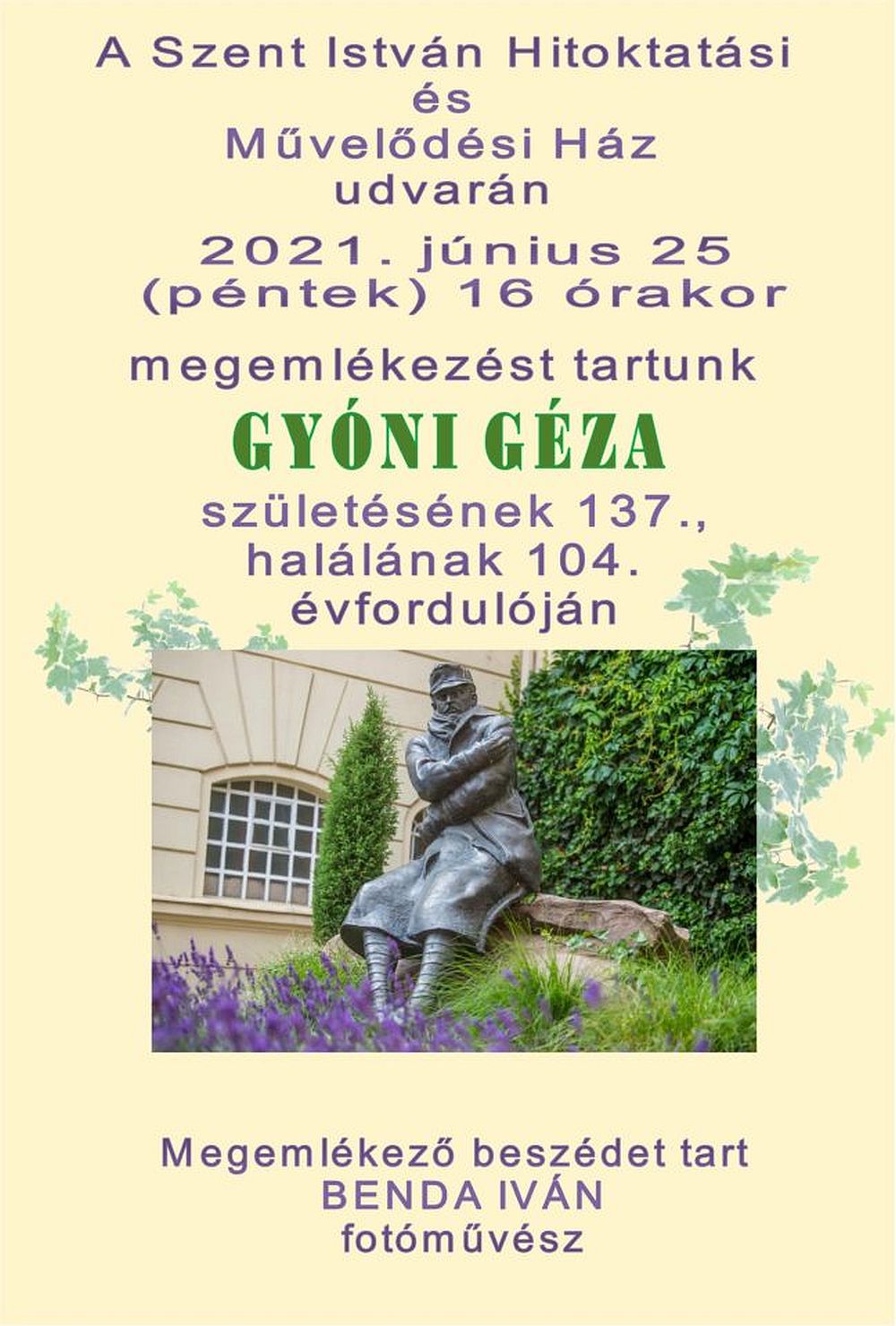 Gyóni Géza költő, író tiszteletére szerveznek megemlékezést június 25-én, pénteken 16 órától a Szent István Hitoktatási és Művelődési Ház Díszudvarán. Az eseményen Benda Iván fotóművész működik közre.