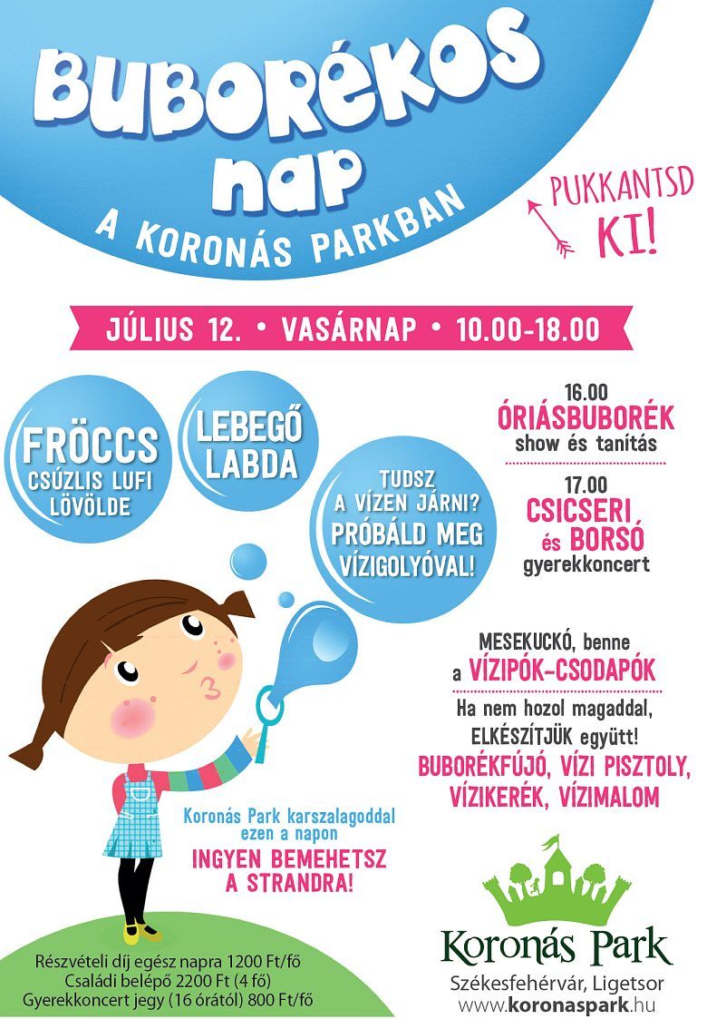Július 12-én, vasárnap a Koronás Parkban minden adott lesz egy frissítő nagy családi játékhoz: izgalmas programokkal várnak minden érdeklődőt a Buborékos napon. A kicsik egész nap játszhatnak vízifocival, vagy a szörf szimulátorral, fújhatják a buborékot, vízipisztolyozhatnak. 16.00 órától lesz az Óriásbuborék Show és tanítás, 17.00 órától pedig a Csicseri és Borsó zenekar gyerekkoncertjén szórakozhatnak.