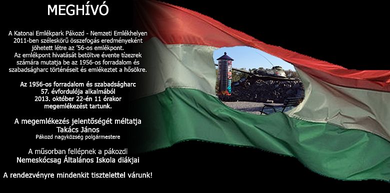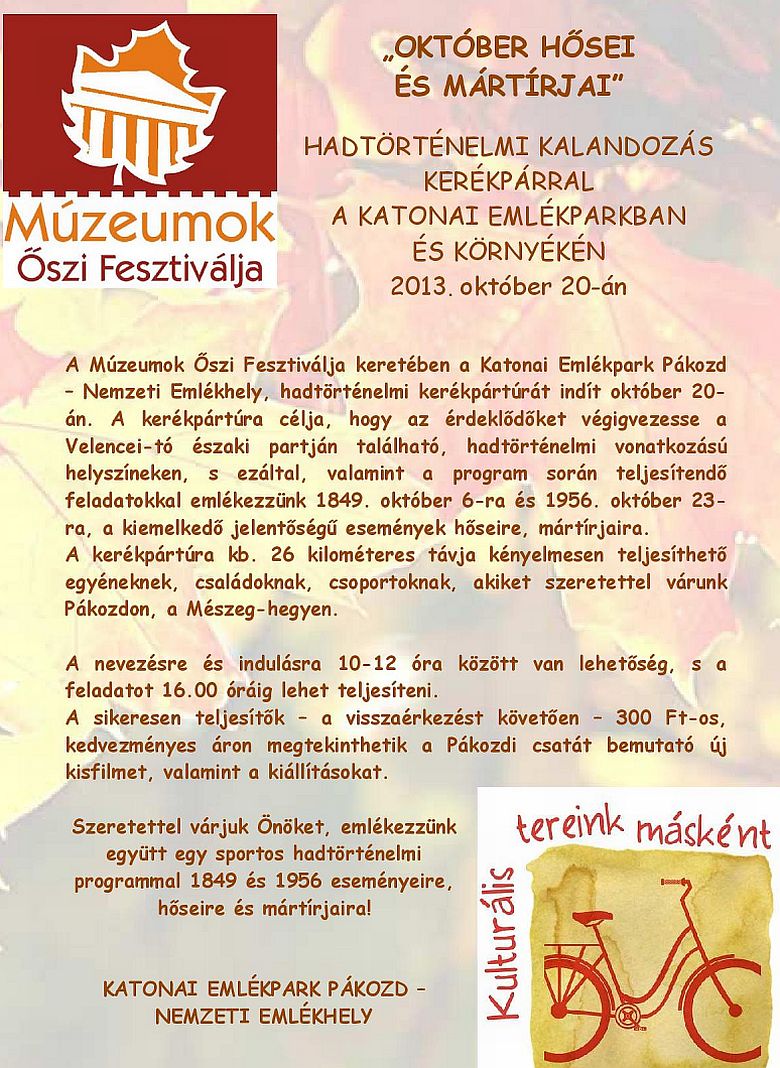 A Katonai Emlékpark Pákozd – Nemzeti Emlékhely az 1956-os forradalom 57. évfordulója alkalmából jövő kedden, délelőtt 11 órakor megemlékezést tart. Ezen kívül október 20-án, vasárnap a Múzeumok Õszi Fesztiválja keretében a Katonai Emlékpark Pákozd – Nemzeti Emlékhely, hadtörténelmi kerékpártúrát is indít.