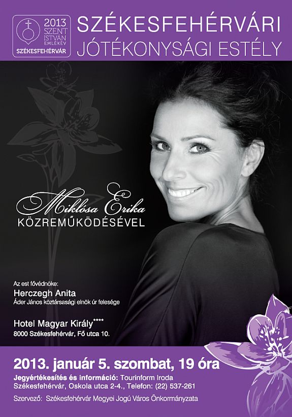 Január 5-én ismét megrendezik a Székesfehérvári Jótékonysági Estélyt. Az esemény házigazdája Miklósa Erika operaénekesnő. A jótékonysági estély a mecenatúra hagyományait hozza vissza. Az Önkormányzat az év méltó elindítása érdekében döntött a Jótékonysági Estély megszervezése mellett, valamint fontos közösségi célok támogatásához is szeretnének így mecénásokat felkutatni. 2013-ban a Szent István Emlékév egyik első és kiemelt programja lesz a január 5-i estély.