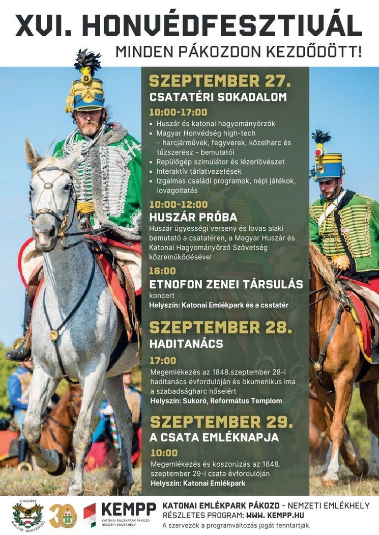 A fesztivál harmadik napján koszorúzás és ünnepi megemlékezés várja az érdeklődőket a Katonai Emlékparkban, ahol közösen hajtanak fejet az 1848. szeptember 29-i győztes pákozdi csata hősei előtt, erősítve a történelmi múlt iránti tiszteletet és összetartozást.