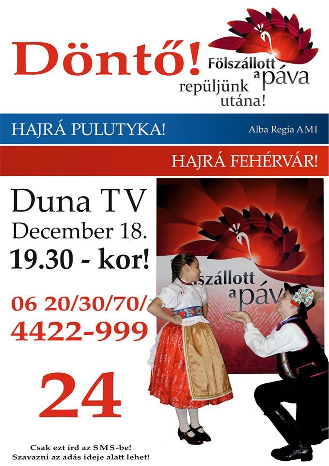 A Fölszállott a páva tehetség kutatóban a táncegyüttesek között az Alba Regia AMI Pulutyka csoportja továbbjutott a döntőbe is. A fehérvári gyerekek várják az Ön szavazatát is december 18-án 19.30-kor a Duna TV adásában. Az együttes kódszáma a 24-es, a szavazatokat a 20/30/70 4422-999-es számra lehet küldeni!