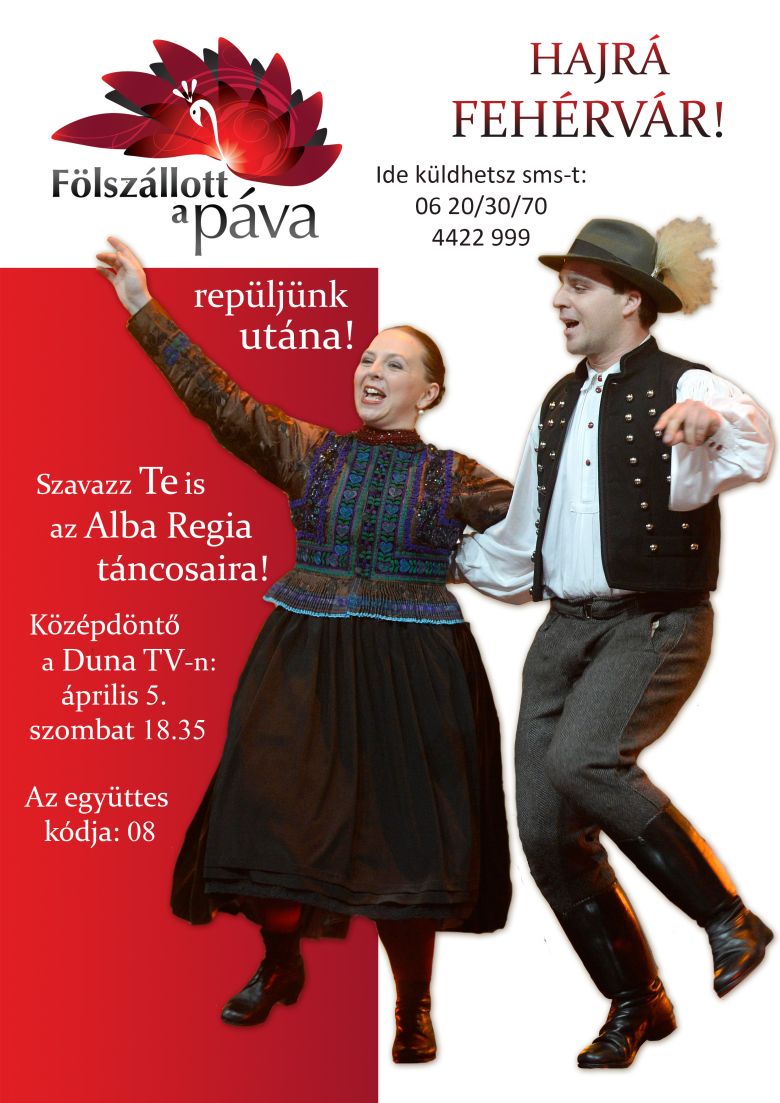 Április 5-én 18.35-től közvetíti a Duna Televízió a "Fölszállott a páva" népzenei és néptánc vetélkedő középdöntőjét, amelyben az Alba Regia táncosai is szerepelnek. Egy versenyzőt a zsűri, egyet pedig a közönség juttat majd a döntőbe, ezért a táncegyüttes arra kéri a fehérváriakat, hogy szükség esetén támogassák őket szavazataikkal. Szavazni sms-ben lehet a 06 20/30/70 4422999-es számokon, az együttes kódja: 08