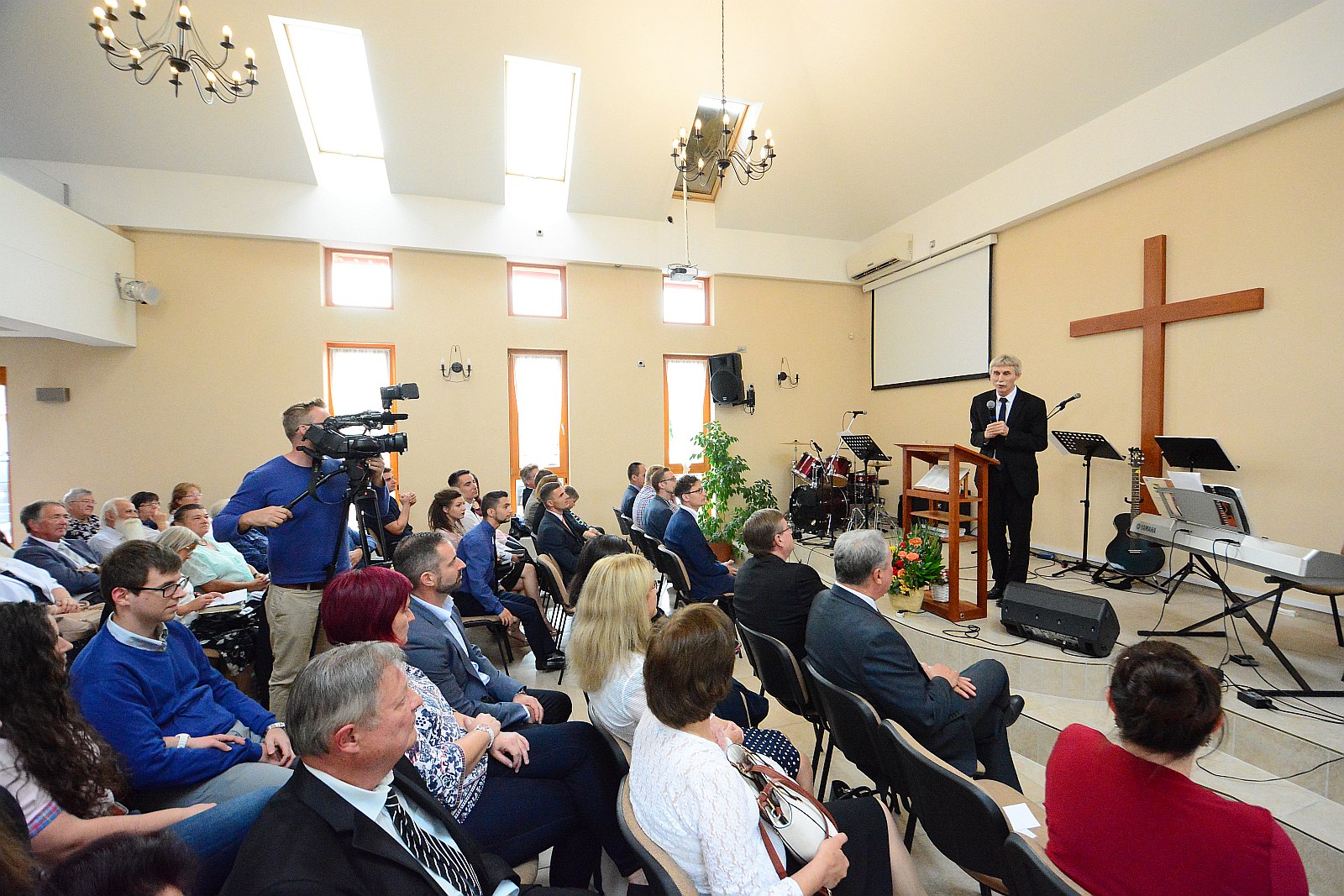 „Beszélhet-e egy polgármester egy gyülekezet meghívására egy imateremben vagy beszélhet-e egyházi személy egy városi rendezvényen?” - tette fel a kérdést. Az állam és az egyház szétválasztása működési szétválasztást jelent, ami nem más, mint például az, hogy az önkormányzat nem szólhat bele egy egyházi közösség életébe. Vannak azonban olyan közös értékeink, amiket közösen vallunk és a mai világban különösen fontos, hogy legyen egy önkormányzatnak és annak vezetőjének is értékválasztása. Székesfehérvár ezer éves történelme összekapcsolódik a hittel és nem jött volna létre a hit és egy értékválasztás nélkül. Azonban a jelenben is számos közös pont van az egyházak és az önkormányzat között, elég csak az óvodákra és iskolákra vagy akár a szociális és kulturális területre gondolni – mondta Fehérvár polgármestere. Előadásában kitért a társadalmi jólét és az értékválasztás ma egyre fontosabbá váló kérdéseire is, mely meghatározó lesz Európa jövője tekintetében is.