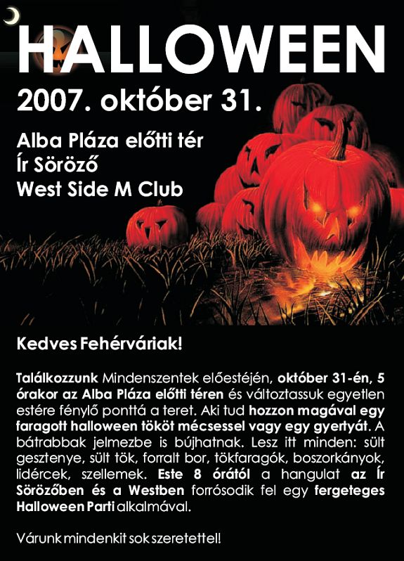 Az Alba Plaza kezdeményezésére Halloween ünnep lesz szerdán késő délutántól a bevásárlóközpont előtti téren. A kezdeményezés mellé állt a város önkormányzata is. A rendezvényen megannyi töklámpásban gyulladnak fel a fények, de lesz sült gesztenye és sült tök is. Aki tud hozzon magával faragott, vagy arra várós tököt. Este nyolc órától a rendezvény az Ír Sörözőben és a Westben folytatódik, ahol évek óta hagyomány már, hogy Mindenszentek előestéjén "Halloween Partit" rendeznek.
