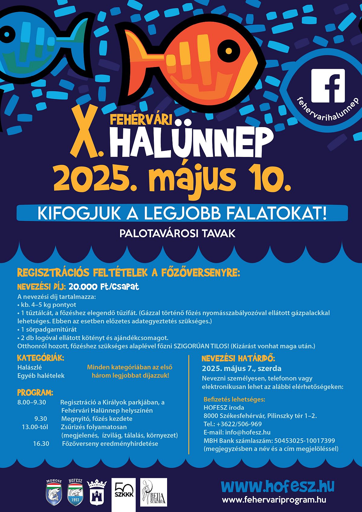 Május 10-én, a Halünnep napján a reggeli órákban indulnak a programok a főzőversennyel, majd az ünnepélyes megnyitón a Székesfehérvár Helyőrségi Zenekar játszik. A színpadon ezután gyerekkoncertek, mesejáték és bűvész váltják egymást, a főzőverseny eredményhirdetése után a Quest utcazenekar játszik, az esemény zárásaként pedig a Unique együttes lép színpadra. Napközben a családokat halsimogató, kisállat-simogató, óriás halas játékpark, vándorjátszótér és kirakodóvásár is várja. Kedvezőtlen időjárás esetén a rendezvény esőnapja május 18., vasárnap.