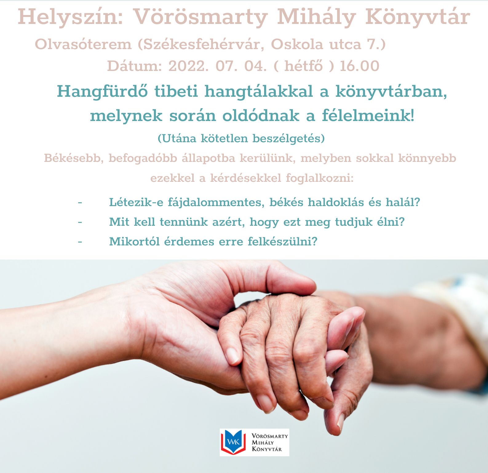 A hangfürdő után előadás és hozzá kapcsolódó beszélgetés lesz a méltósággal megélt halálról. Létezik-e fájdalommentes, békés haldoklás és halál? Mit kell tennünk azért, hogy ezt meg tudjuk élni? Mikortól érdemes erre felkészülni? Beke Éva mentálhigiénés munkatárs vezetésével ezekre a kérdésekre keresik a választ a résztvevők a Vörösmarty Mihály Könyvtár Olvasótermében.