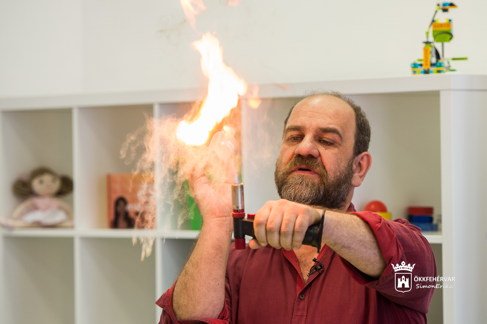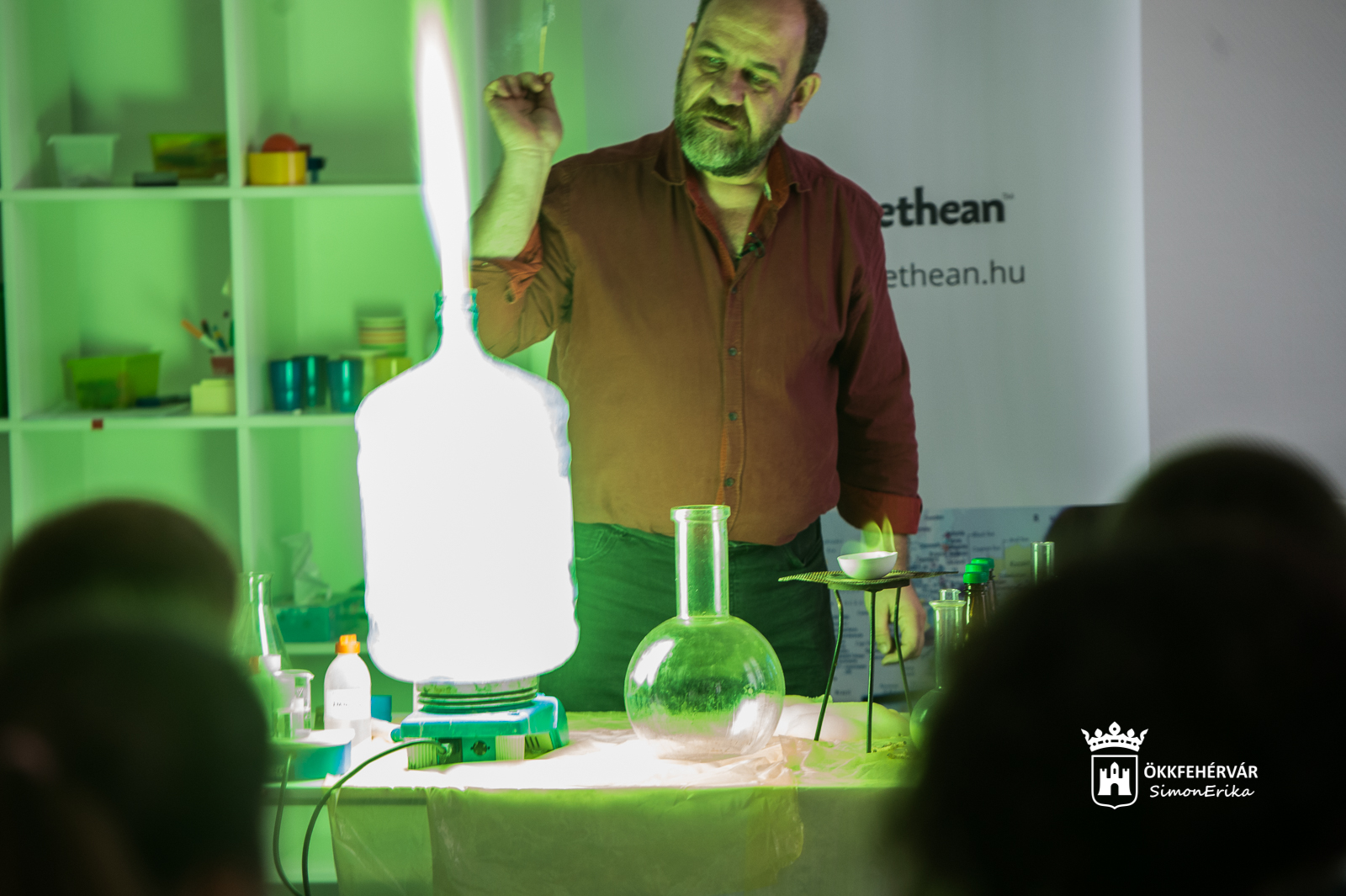 Az egri Eszterházy Károly Egyetem Pedagógusképző Központjának főigazgatója székesfehérvári középiskolásoknak tartott látványos kémiaórát kedd délután az Alba Innovárban. A kémiai reakciók sebességét szemléltető kísérletekben a hirtelen színváltozásoktól a lángokon át a gőzfelhőkig a kémia minden látványos eleme felvonult.