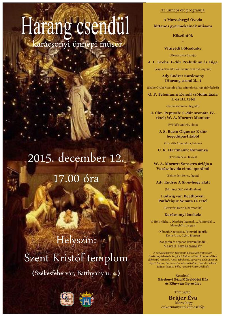 „A Gárdonyi Géza Művelődési Ház az év minden szakában arra törekszik, hogy tovább örökítse a hagyományokat, a népszokásokat. Decemberben különösen fontossá válik, hogy nyissunk a család, a barátok, az ismerősök felé, amihez különösen jó alkalom egy ilyen rendezvény.” - mondta el Iszkádi Erika, a Gárdonyi Géza Művelődési Ház és Könyvtár igazgatója. A városi programok mellett fontos, hogy Maroshegyen is legyen olyan rendezvény, ahol a szűkebb közösség együtt lehet, fogalmazott, amire a „Harang csendül” koncert nagyszerű alkalom: „Arra törekszünk, hogy felidézzük az ünnep hangulatát, és az embereknek meghittséget adjunk át a műsorral.”