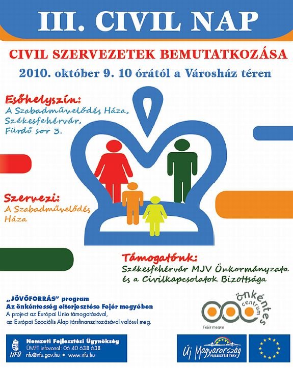 Újra bemutatkozási lehetőséghez jutnak a Székesfehérváron működő civil szervezeteknek azzal, hogy harmadik alkalommal rendezik meg a Civil Napot. A program október 9-én szombaton 10.00 órakor kezdődik a Városház téren, ahol egyesületek, alapítványok, klubok kitelepülve közösen találkozhatnak a fehérváriakkal. A rendezvény lebonyolítását az idei évben az önkormányzat a Szabadművelődés Házával és a Civil Szervezetek Regionális Szövetségével közösen végzi. Kiss Dorottya, a Szabadművelődés Házának igazgatója elmondta, hogy 11 órától az Alba Regia Táncegyesület néptáncbemutatójával indulnak a programok, majd 18 órakor a Méhkasaula Kulturális Egyesület audiovizuális estjével zárul a rendezvény. Kiss Dorottya elmondta, hogy a III. Civil Nap rendezvényein nemcsak fehérvári egyesületek vesznek részt, több civil szervezet érkezik a megyéből, így a Velencei-tó térségéből és Dunaújvárosból is. A szervezők kiválasztották az esőhelyszínt is, rossz idő esetén a Szabadművelődés Háza aulájában rendezik meg a programokat.