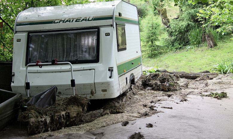 Több Fejér megyei településen is felhőszakadás volt vasárnap délután. A rövid idő alatt lehulló jelentős mennyiségű eső a többszörösére duzzasztotta a Bakonykútiban található Kertalja patak vizét. A sodrás erejét jól mutatja, hogy elsodort egy lakókocsit és egy fémből épített gyalogos hidat is.
