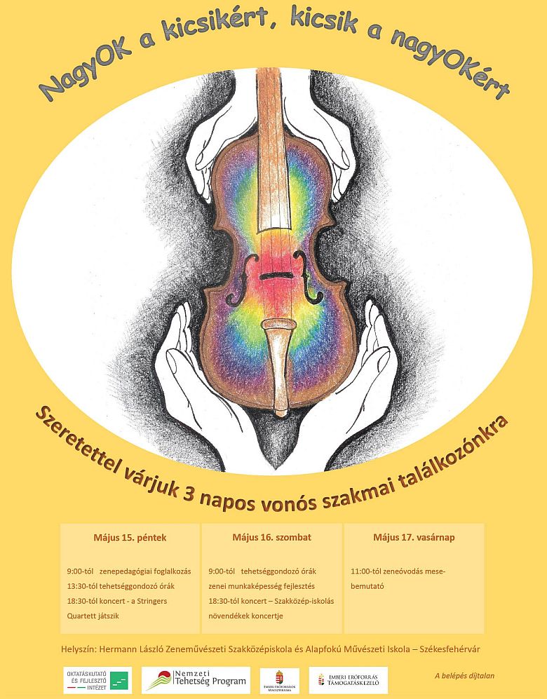 A Székesfehérvári Hermann László Zeneművészeti Szakközépiskola és Alapfokú Művészeti Iskola vonós tanszaka nyertes pályázat keretében háromnapos szakmai programot rendez május 15. és 17. között „NagyOk a kicsikért, kicsik a nagyOkért” címmel. A szakmai kurzusok mellett minden nap egy-egy nyilvános koncert is szerepel a sorozatban, vasárnap 11 órától például a zeneovisok adnak elő egy mesét hangszeres kísérettel.