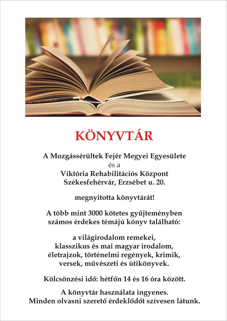 Könyvtárat nyitott az Erzsébet út 20. szám alatt a Mozgássérültek Fejér Megyei Egyesülete és a Viktória Központ. A több mint 3000 kötetes gyűjteményben megtalálhatók a világirodalom remekei éppúgy, mint a mai magyar irodalom és a krimik. Kölcsönözni hétfőnként 14 és 16 óra között lehet.